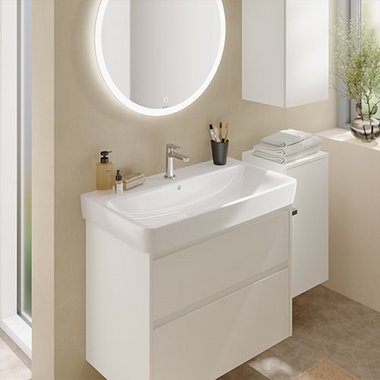Die modernisierten Geberit Renova Plan Waschtischunterschränke sind auch als Set erhältlich. Die Möbelwaschtisch Sets kombinieren den eingelassenen Renova Waschtisch mit dem passenden Waschtischunterschrank.